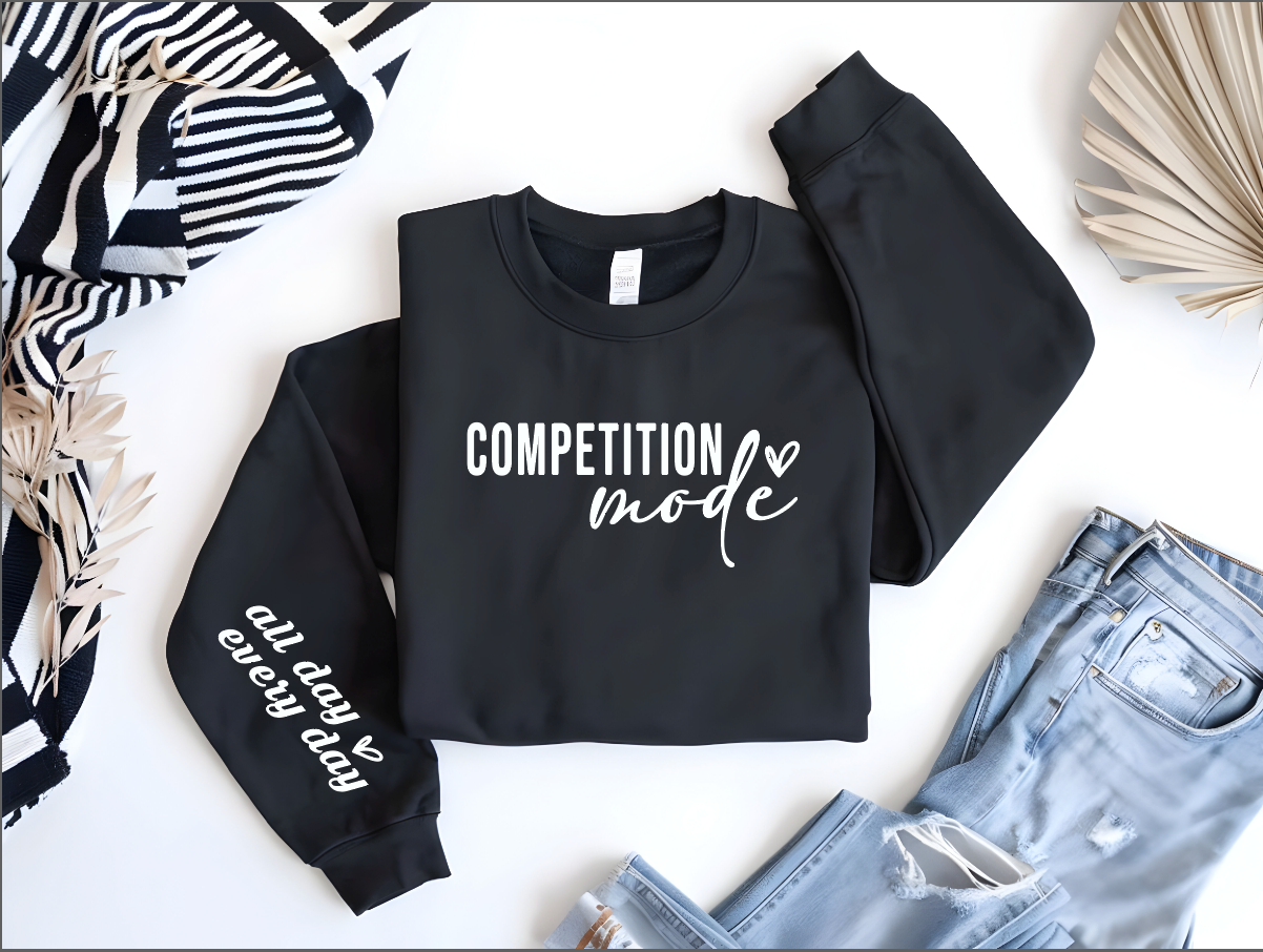 Get ready to turn up the heat with our Competition Mode crew sweatshirt! Whether you're at the studio, cheering from the sidelines, or gearing up for the next big competition, this sweatshirt has got you covered. Featuring the bold "Competition Mode" graphic on the front and "All Day, Every Day" on the sleeve, it’s the perfect way to show that you’re always in the zone, ready to support your dancer!