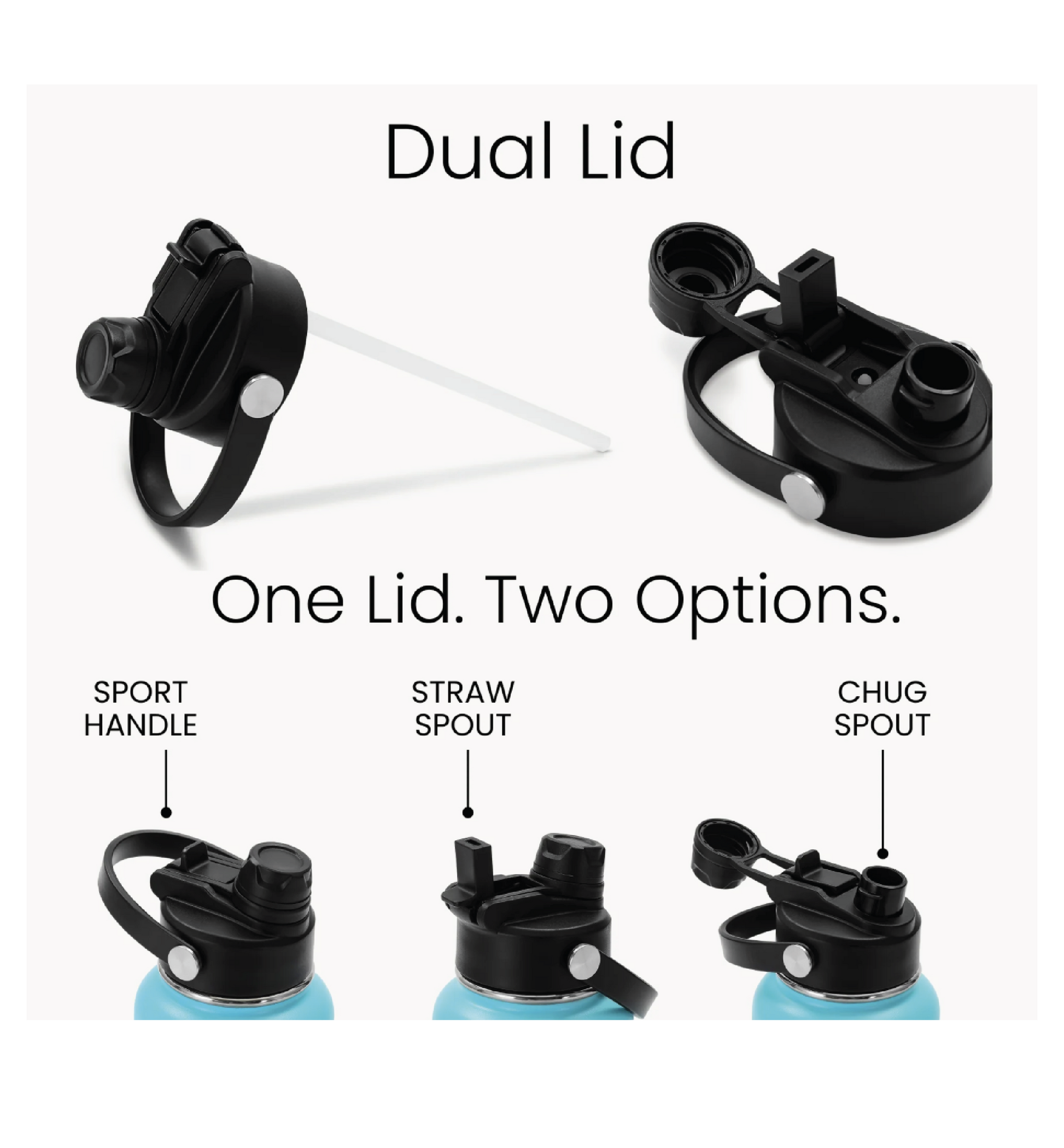 Dual Lid Design: Includes straw spout and chug spout with built-in carry handle