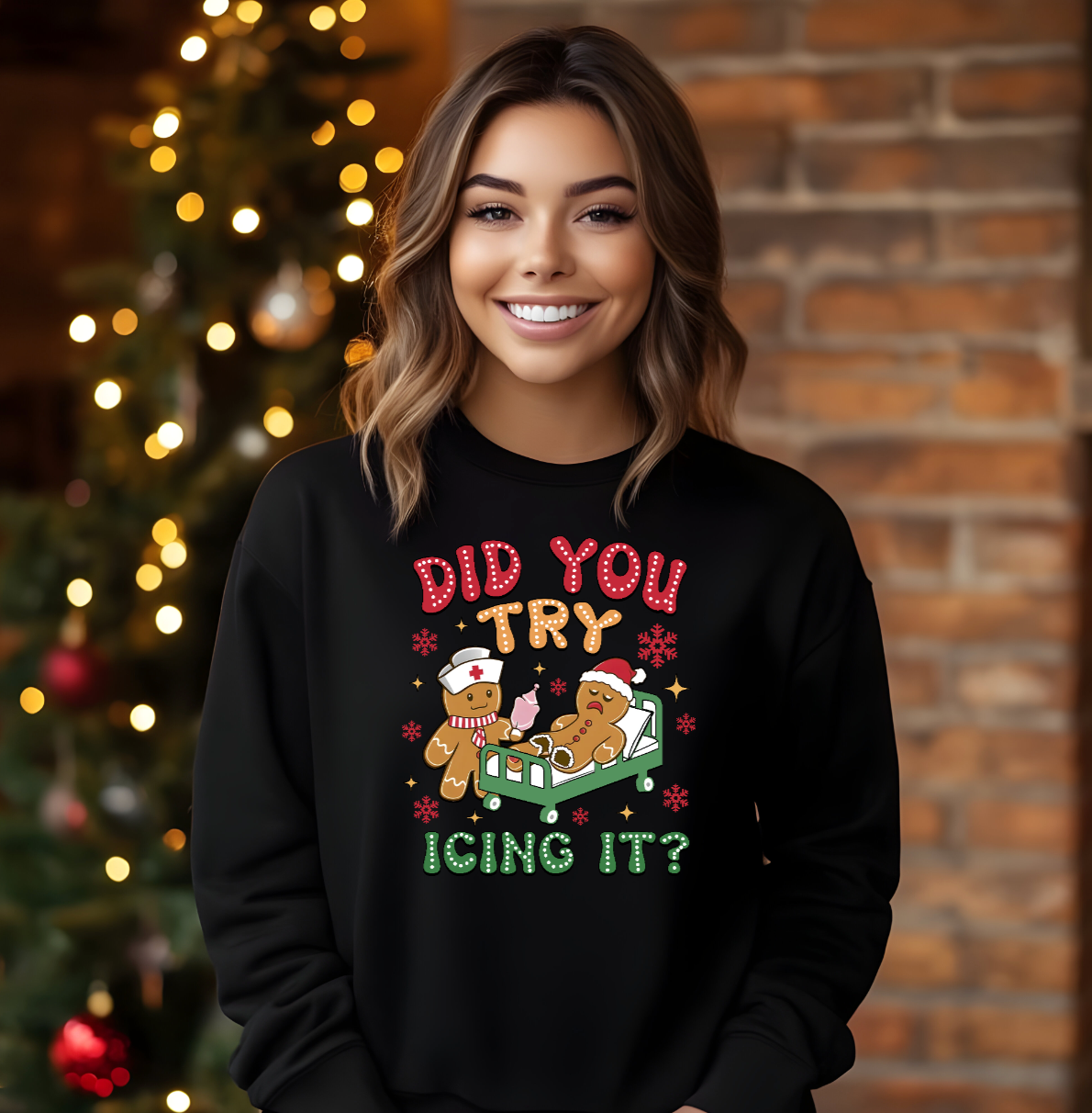 This shirt features an emergency situation at the Gingerbread ER. A poor gingerbread man is flat on his back in a hospital bed, looking a little worse for wear. But fear not! His trusty gingerbread nurse is on the scene, armed with an icing bag and ready to patch things up. Is the icing the cure? Who knows, but at least it looks delicious.