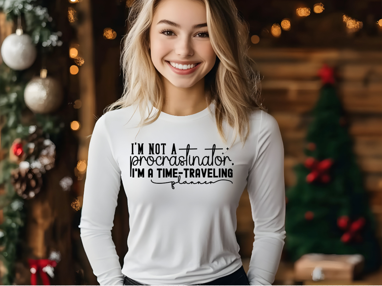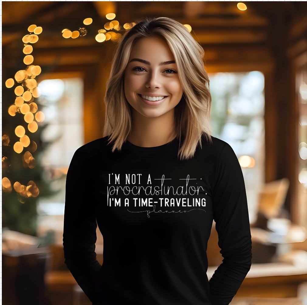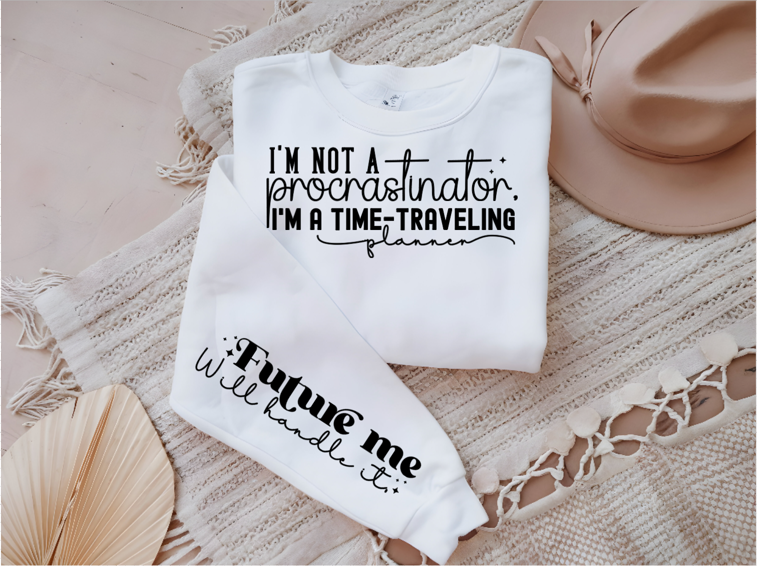 Introducing the ultimate wardrobe essential for the eternally optimistic: our “I’m Not a Procrastinator, I’m a Time Traveling Planner” sweatshirt! This cozy masterpiece not only keeps you warm but also deflects judgment like a superhero cape. Featuring the bold proclamation on the front, it boldly announces your unique approach to productivity—why do today what your future self can totally handle later?