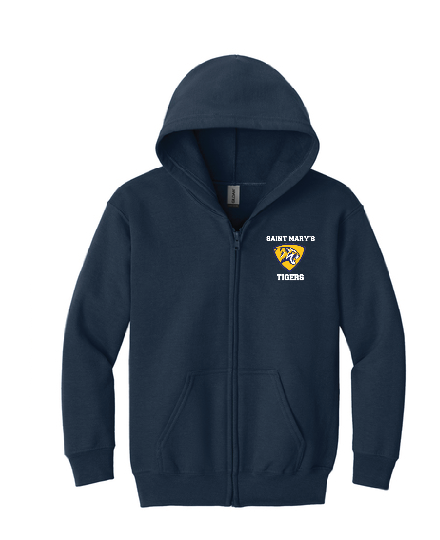 Stay warm and comfortable in this classic navy zip-up hoodie, perfect for everyday wear and school spirit.